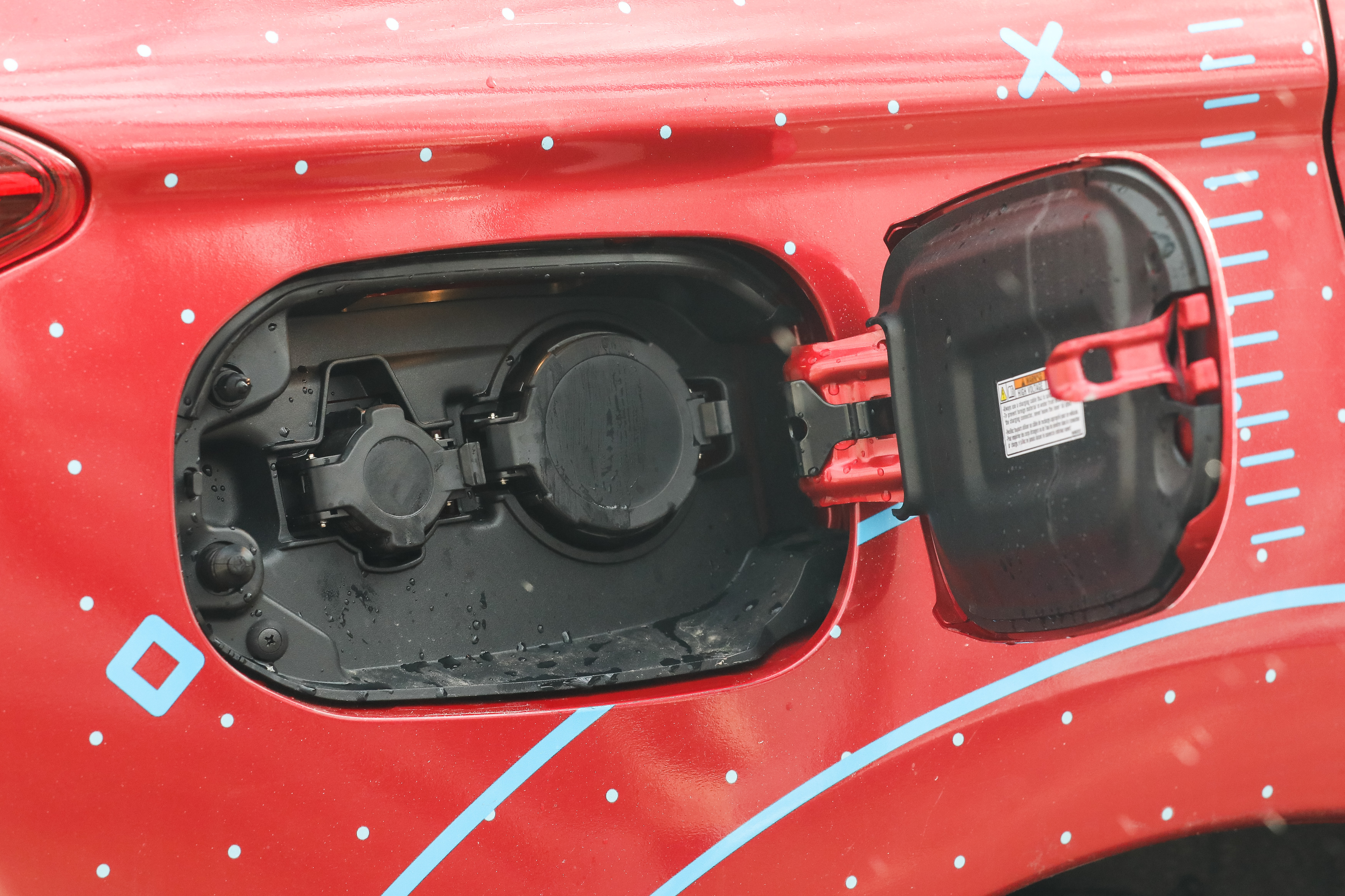 Clapeta pentru rezervor este pe parte stângă, iar clapeta pentru încărcarea electrică este pe partea dreaptă.