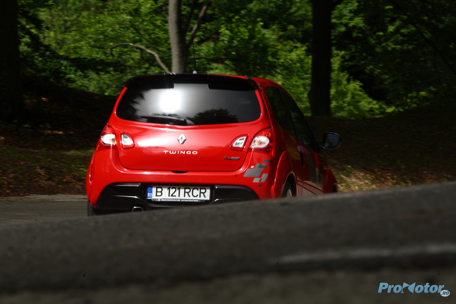 Cutia de viteze este atent realizată, în spiritul Renault Sport, iar etajarea scurtă te scapă rapid de “a-ntâia şi-a doua”, doar ca să ajungi în treptele superioare, unde Twingo R.S. îşi intră în drepturi. Dacă până în 3.000-3.500 rpm motorul mai mult tace, peste acest prag veţi observa că propulsorul face…zgomot, asistat şi de evacuare, lucru aclamat sporadic de câte o alarmă declanşată involuntar.