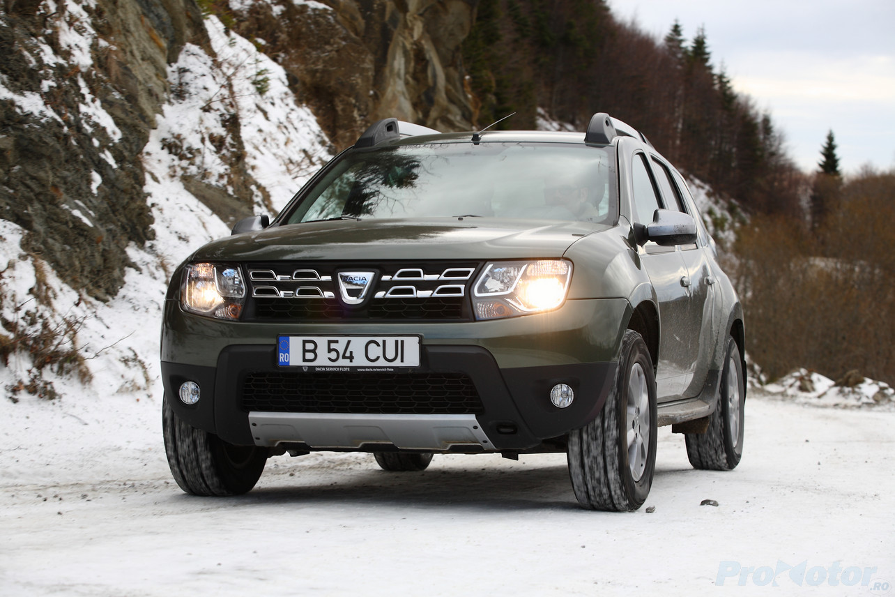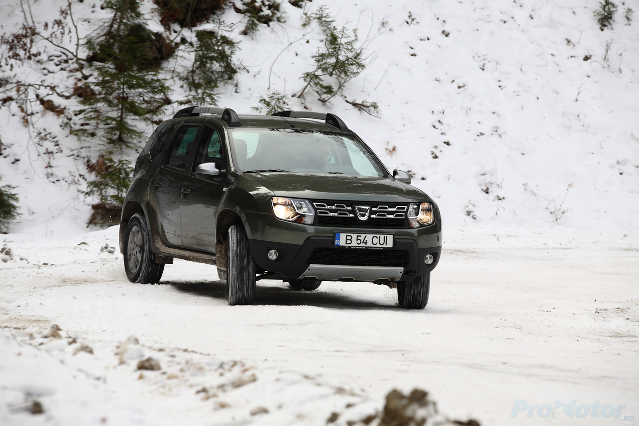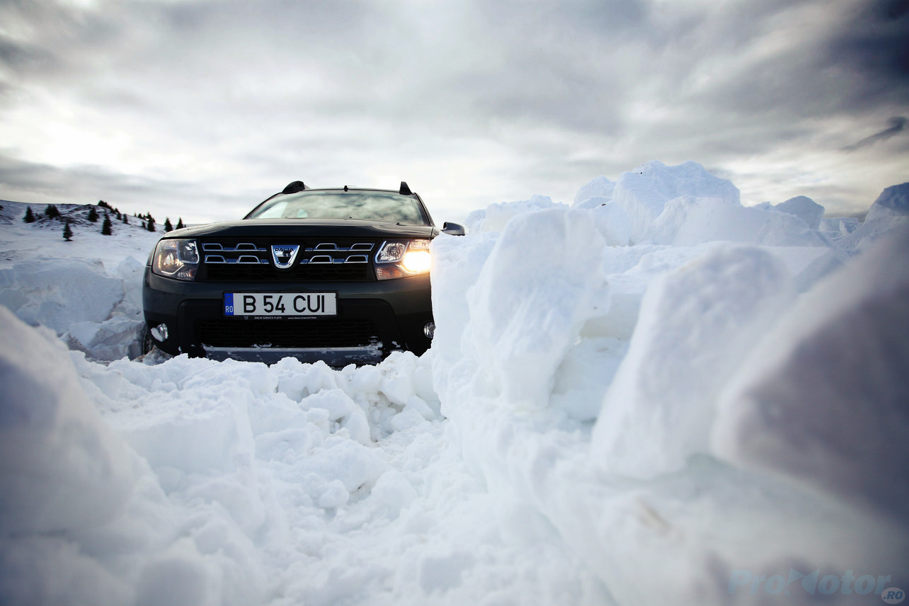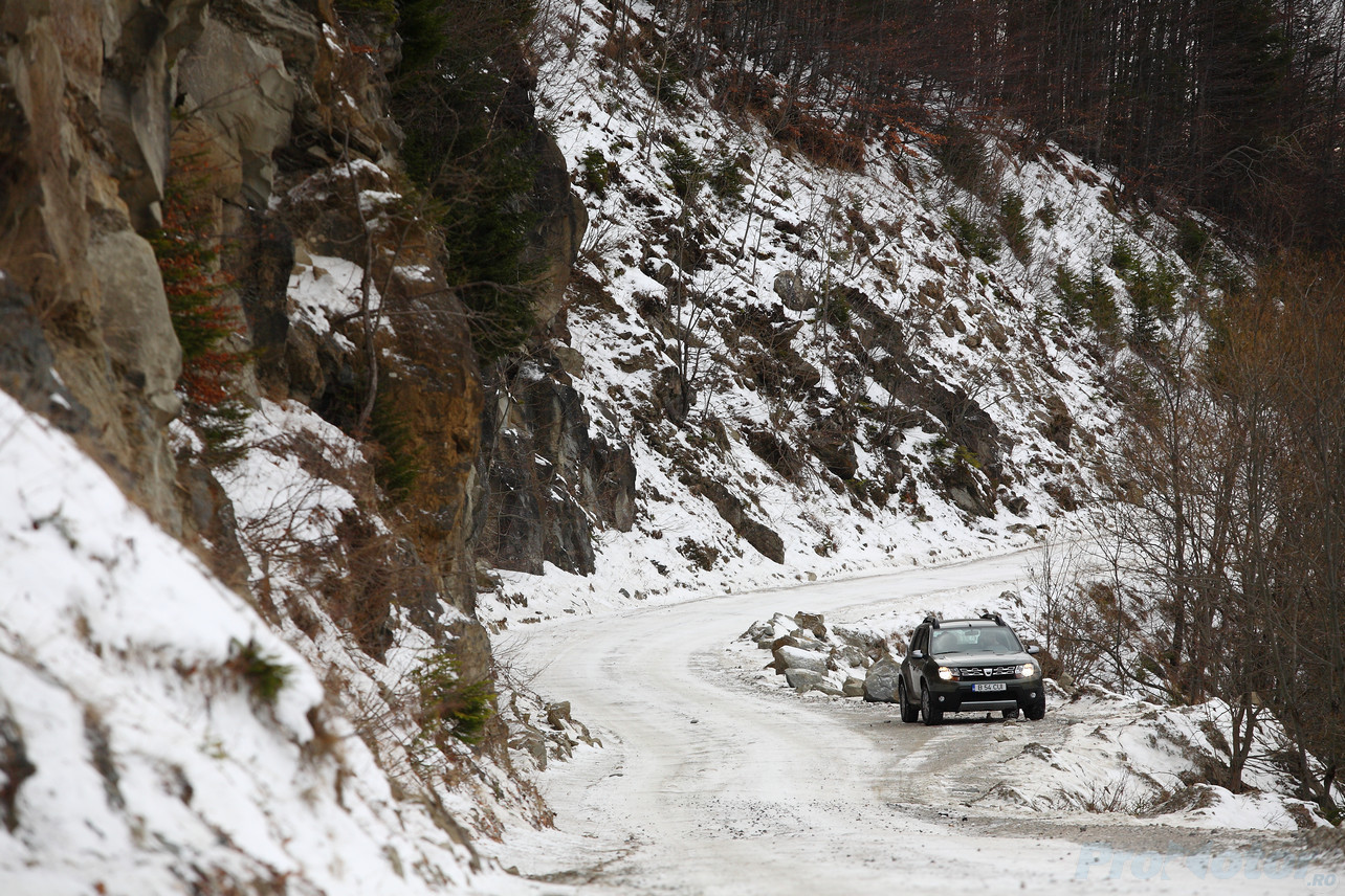 Odată ajunşi în zona de macadam, am mai remarcat un atu al lui Duster – nu simte deloc – dar absolut deloc – pietrele. Acolo unde pe şosea ai fi dorit ceva mai multă fermitate din partea direcţiei, aici apreciezi faptul că volanul nu ţi se smuceşte în mâini, dar şi că ţi se comunică totuşi ce ai sub roţile faţă. Pe zăpadă tasată, Dusterul rămâne mai stabil decât Yeti, iar asta e de apreciat, pentru că de-aia îţi şi iei un Duster, la urma-urmei, nu?