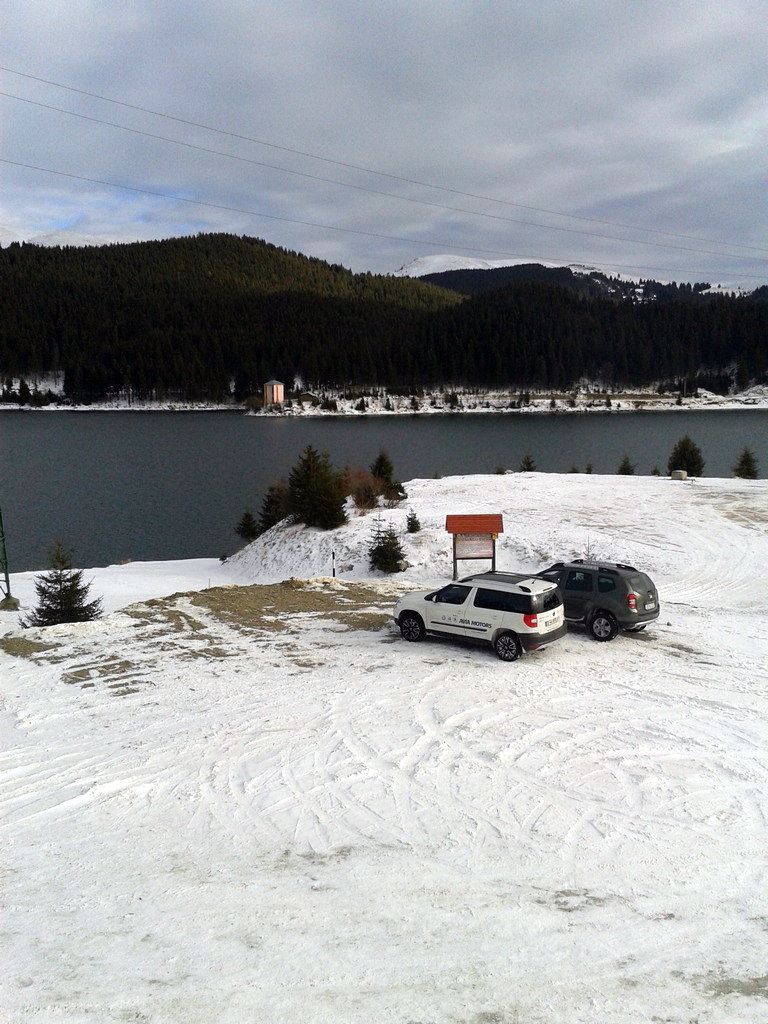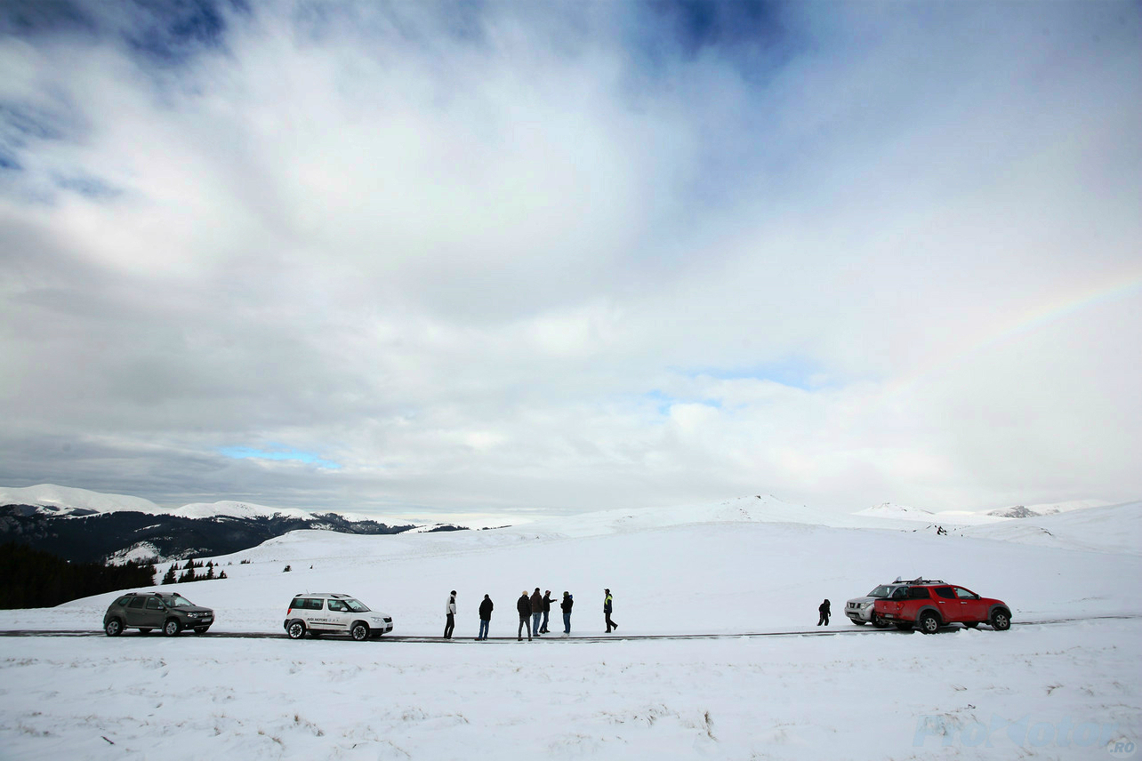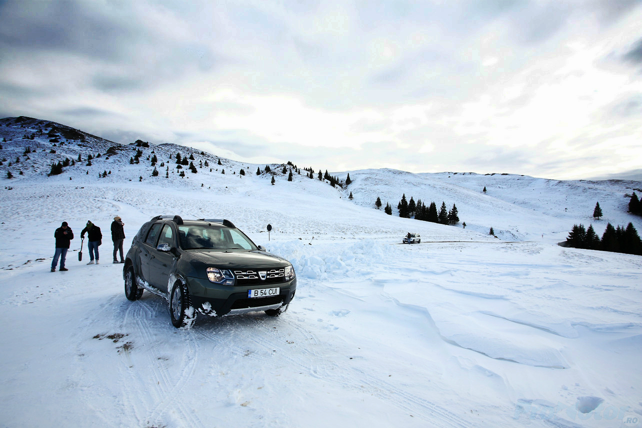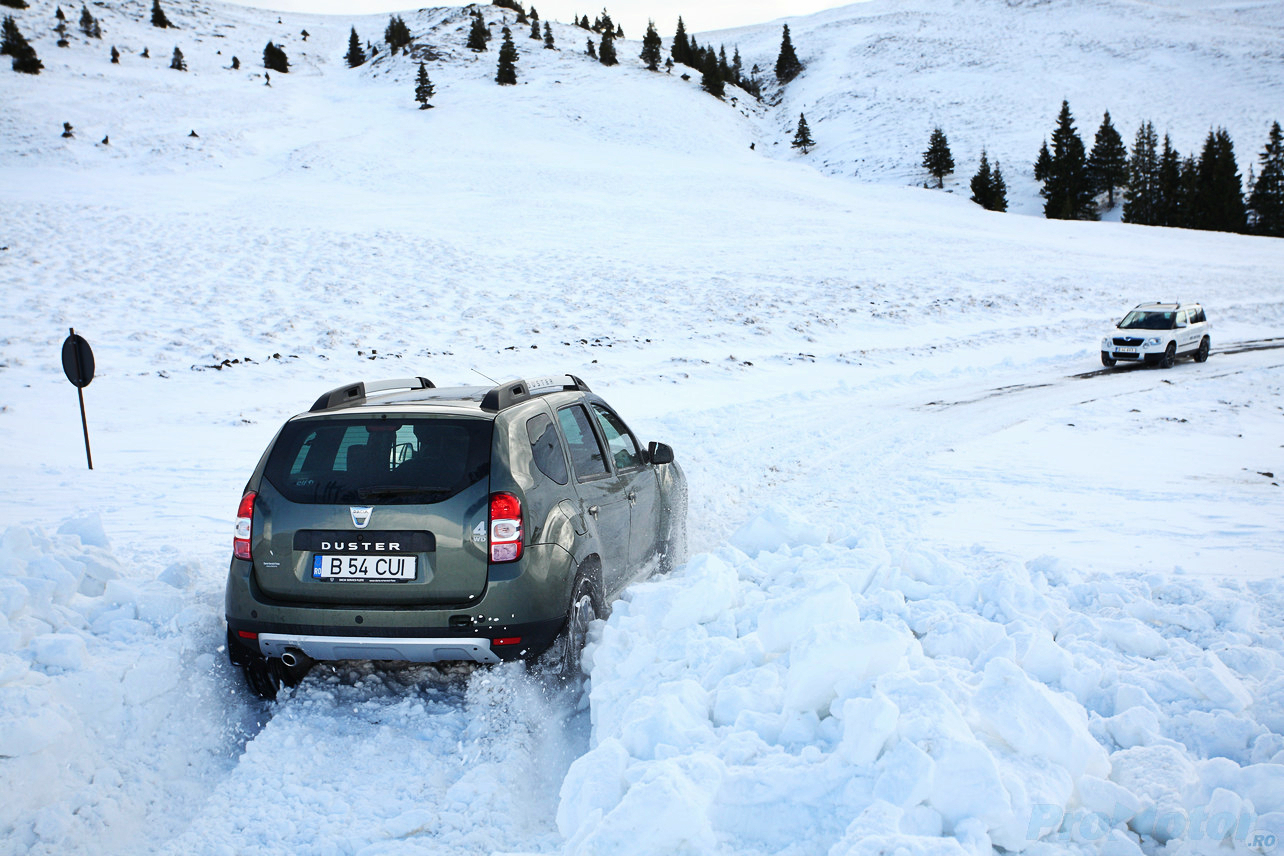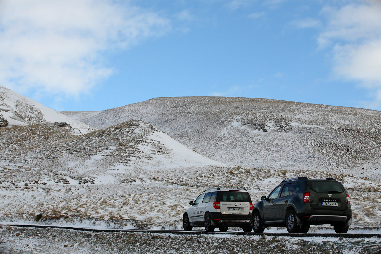 În fine, odată ajunşi pe platoul Bucegilor, am dat şi de stratul de zăpadă cu gheaţă de care ne temeam la începutul călătoriei. Aici diferenţa o fac două lucruri: anvelopele şi garda la sol. Cum anvelopele nu erau cu ţinte, degeaba ai un sistem 4×4 capabil să trimită 50% din cuplu pe puntea spate, căci nu te vei mişca din loc pe gheaţă. Puntea spate intervine doar atunci când tracţiunea pe puntea faţă se pierde, iar dezactivarea ESP-ului e o condiţie necesară atunci când intri în zăpezi mai mari. Aici e greu să observi o diferenţă semnificativă care să ţină strict de trenul de rulare între Duster şi celelalte crossovere, chiar şi dacă Duster are posibilitatea de a bloca distribuţia cuplului în mod egal pe cele două punţi. Dimpotrivă, garda la sol ne-a ajutat să spulberăm troienele de zăpadă de pe drum, acolo unde Yeti chiar avea nevoie să găsească liber în faţa sa.