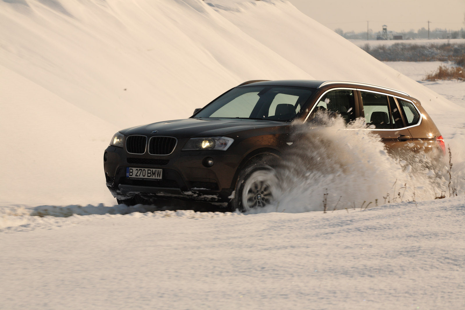 Suspensia îşi face treaba cu brio şi absoarbe toate gropile şi dâmburile de pe drumurile patriei. Nici cu sistemul de tracţiune integrală permanentă xDrive nu m-am făcut de râs, deşi mă aşteptam să rămân împotmolit în primul metru de zăpadă afânată. Dar nu s-a întâmplat asta, aşa că nu credeţi tot ce vedeţi la televizor, da? Când am atacat un deal înzăpezit, omătul sărea în toate direcţiile, iar X3-ul înainta maiestuos. Bine, în această mică aventură încununată cu succes au jucat un rol destul de important şi anvelopele de iarnă foarte bune.