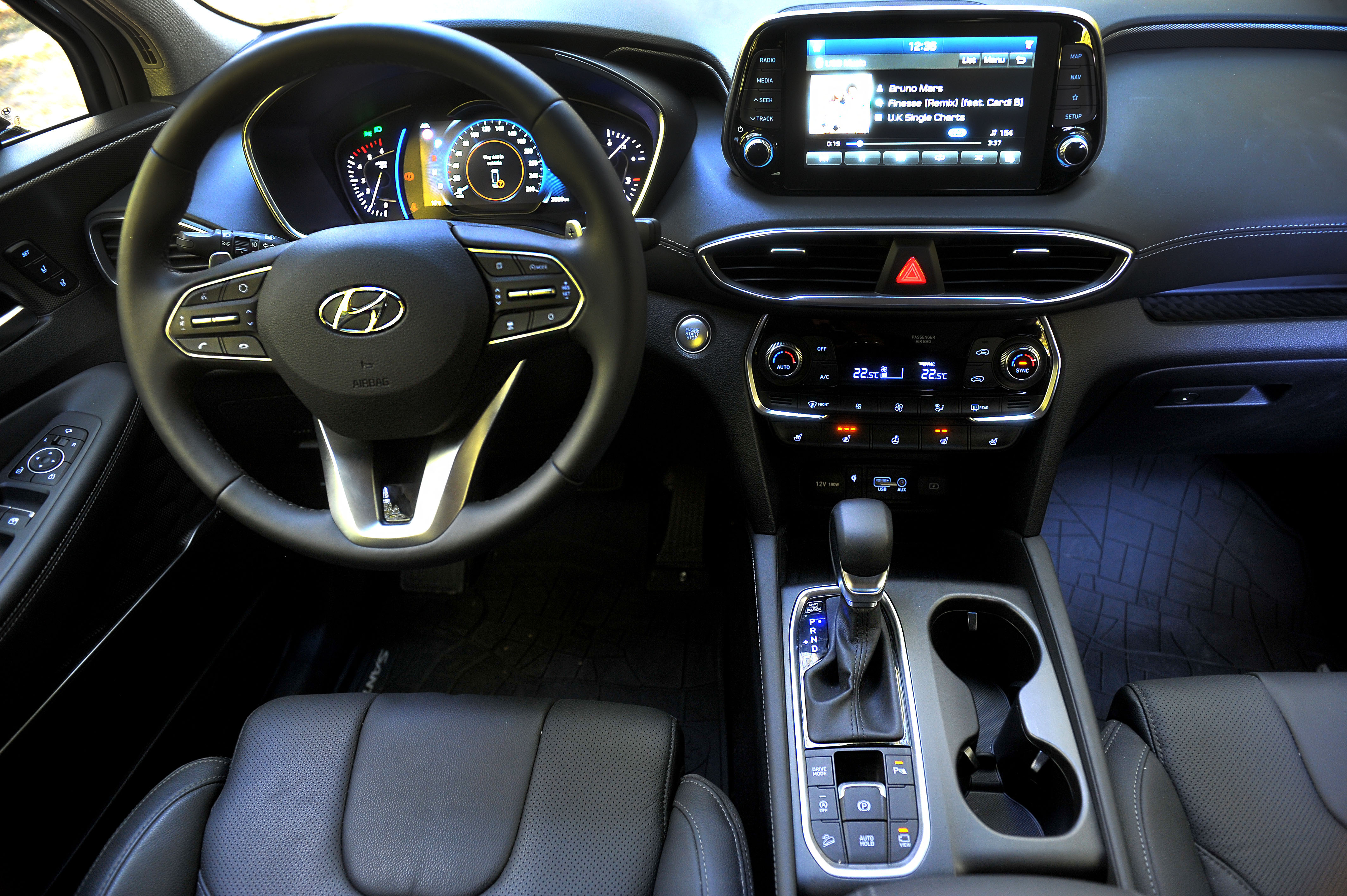 Primul lucru care se simte la interiorul lui Santa Fe este spaţiul foarte generos şi senzaţia de automobil premium. Calitatea materialelor şi a asamblării din echiparea de top sunt toate foarte bune. Scaunele au tapiţerie de piele, sunt reglabile electronic, încălzite şi ventilate. Bordul şi uşile sunt de asemenea îmbrăcate in piele, iar din loc în loc se mai văd plastice mate şi finisaje din aluminiu pe muchiile gurilor de aerisire. Lista dotărilor de la interior mai numără şi un volanul încălzit, reglabil pe înălţime şi adâncime.