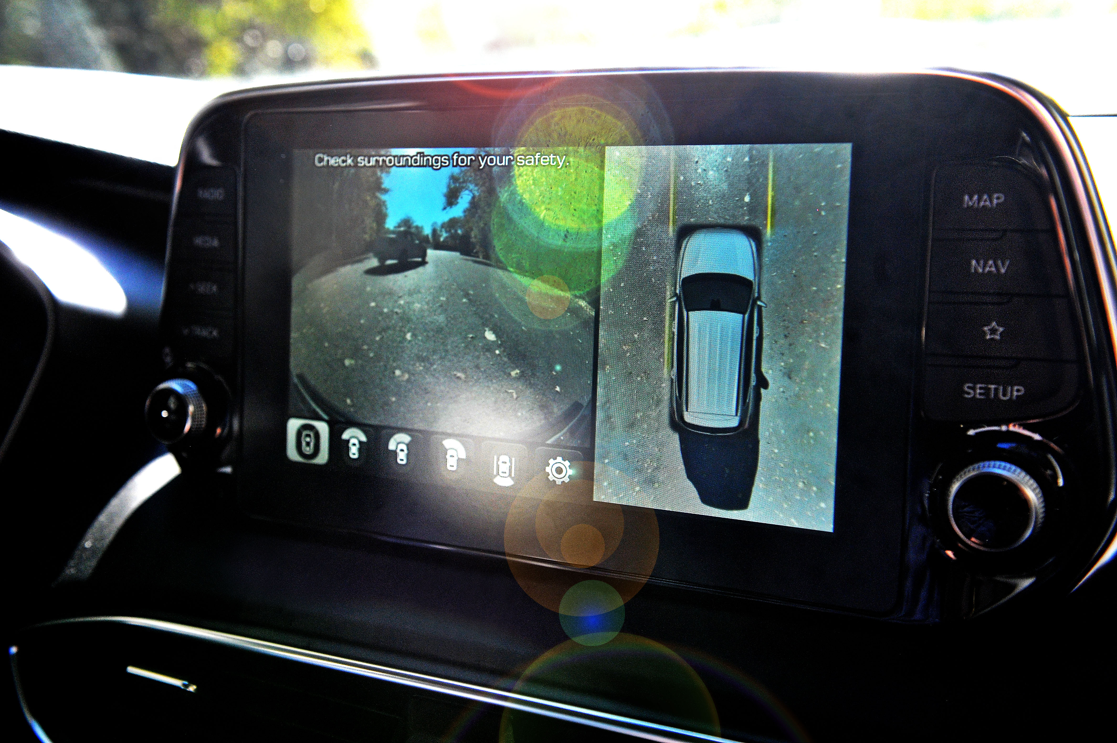 Sistemul de infotaintment vine cu un display de 8 inchi care integrează toate caracteristicile de navigaţie şi conectivitate, iar pasagerii sau şoferul îşi pot conecta smartphone-urile atât prin Apple CarPlay cât şi Android Auto. Singurul reproş legat de dispaly este că marginea sa lucioasă este un veritabil magnet de amprente, iar fără o dereticare constantă va căpăta un aspect neîngrijit. Butoanele fizice de pe margine ajută la navigarea cu uşurinţă prin meniuri. Santa Fe oferă şi un pad inductiv de încărcare pentru telefoane mobile.