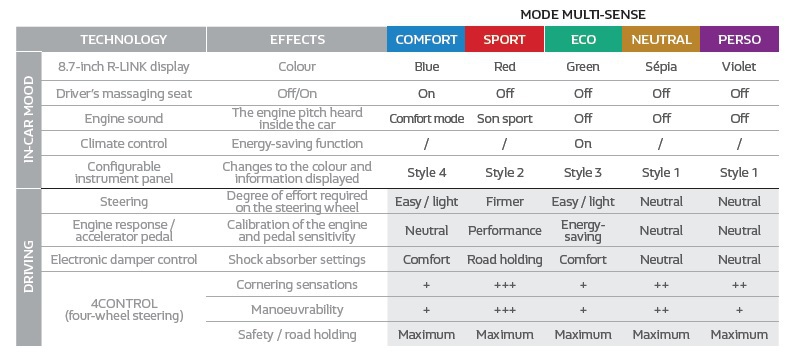 Sistemul MULTI-SENSE  (folosit şi pe noua generaţie Espace) înglobează toate funcţiile maşini în ceea ce priveşte climatizarea, sistemele de asistenţă la condus, reglajele scaunelor , sistemul de navigaţie şi si sistemul audio. Prin intermediul acestuia, şoferul poate să aleagă cinci moduri de condus: Comfort, Sport, Eco, Neutral şi Perso (acesta din urmă putând fi personalizat).