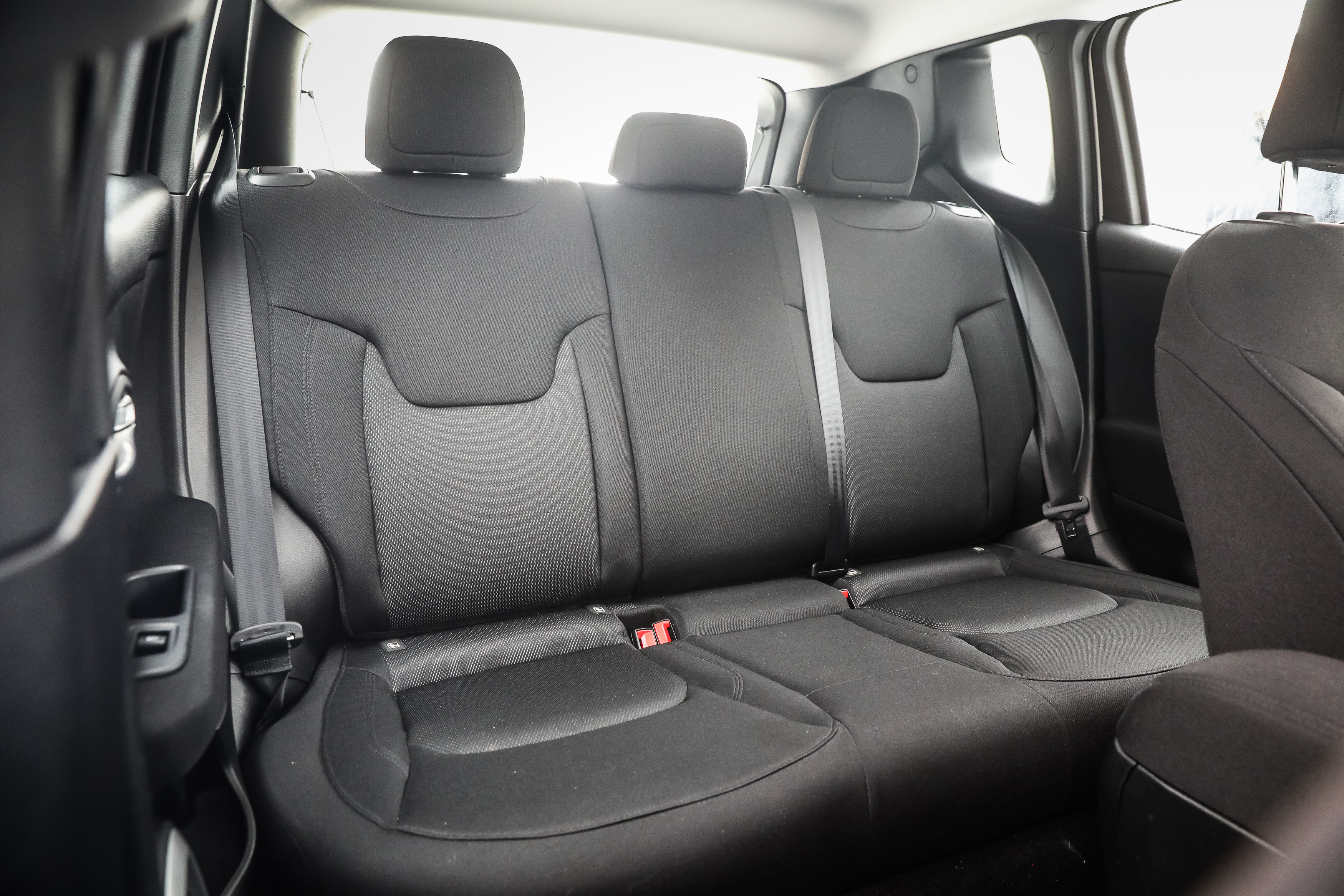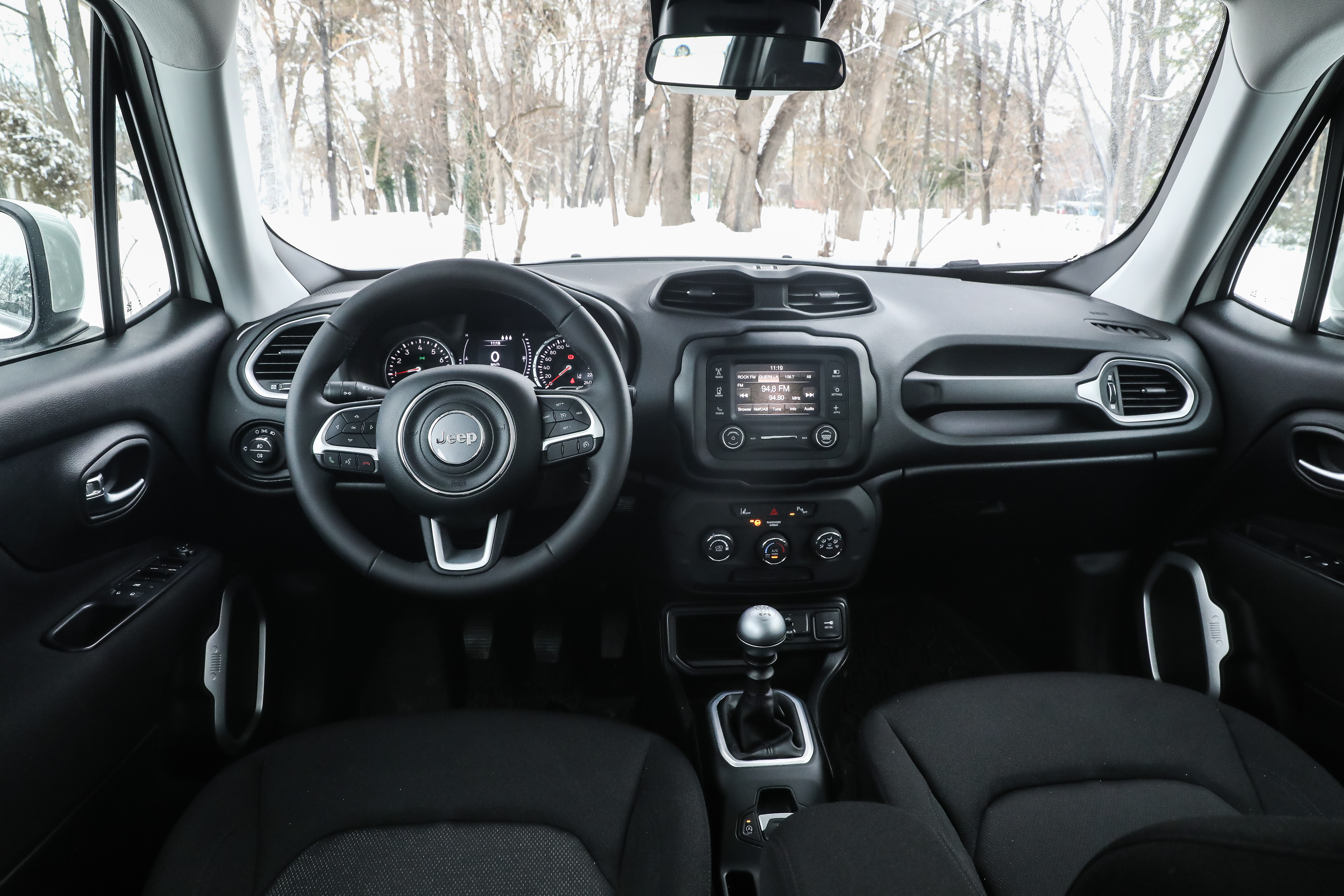 Şi la interior se păstrează câteva elemente specifice mărcii. Volanul (reglabil pe înălţime şi adâncime) este împărţit cu Cherokee, mânerul de susţinere de pe bord, forma boxelor de pe uşi şi plasticele tari primindu-le de la Wrangler. Materialele, calitatea asamblărilor şi dimensiunile generoase ale habitaclului emană siguranţă şi te face să te simţi ca şi cum te-ai afla într-o maşină mult mai mare decât pare din exterior.