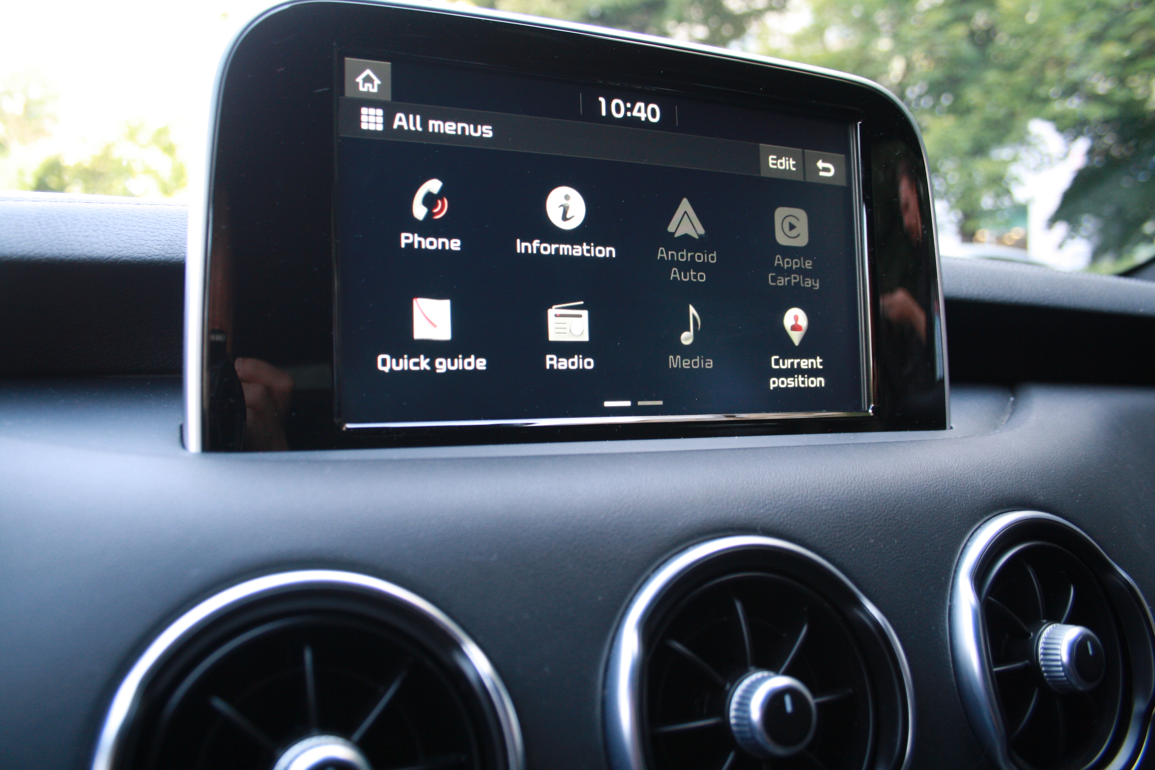 Interiorul este ultra-tehnologizat, dar totuşi aerisit. Aglomeraţia de tehnologii şi sisteme de asistenţă este impresionantă: sistem Head-Up Display cu setări de culoare, reglaje electrice cu memorie pentru scaunele acoperite cu piele perforată – ventilate şi încălzite, 5 moduri de condus şi nenumărate sisteme de siguranţă la volan. Cockpit-ul oferă o poziţie joasă la volan, cu vizibilitate bună. Sistemul infotaiment cu ecran tactil de 8 inchi este amplasat sus, aşa cum trebuie, şi este destul de intuitiv în operare. Pentru cele mai utilizate funcţii, Stinger are scurtături în bord, iar aici nu ne referim doar la meniul principal, ci şi schimbarea melodiei sau a postului de radio.
