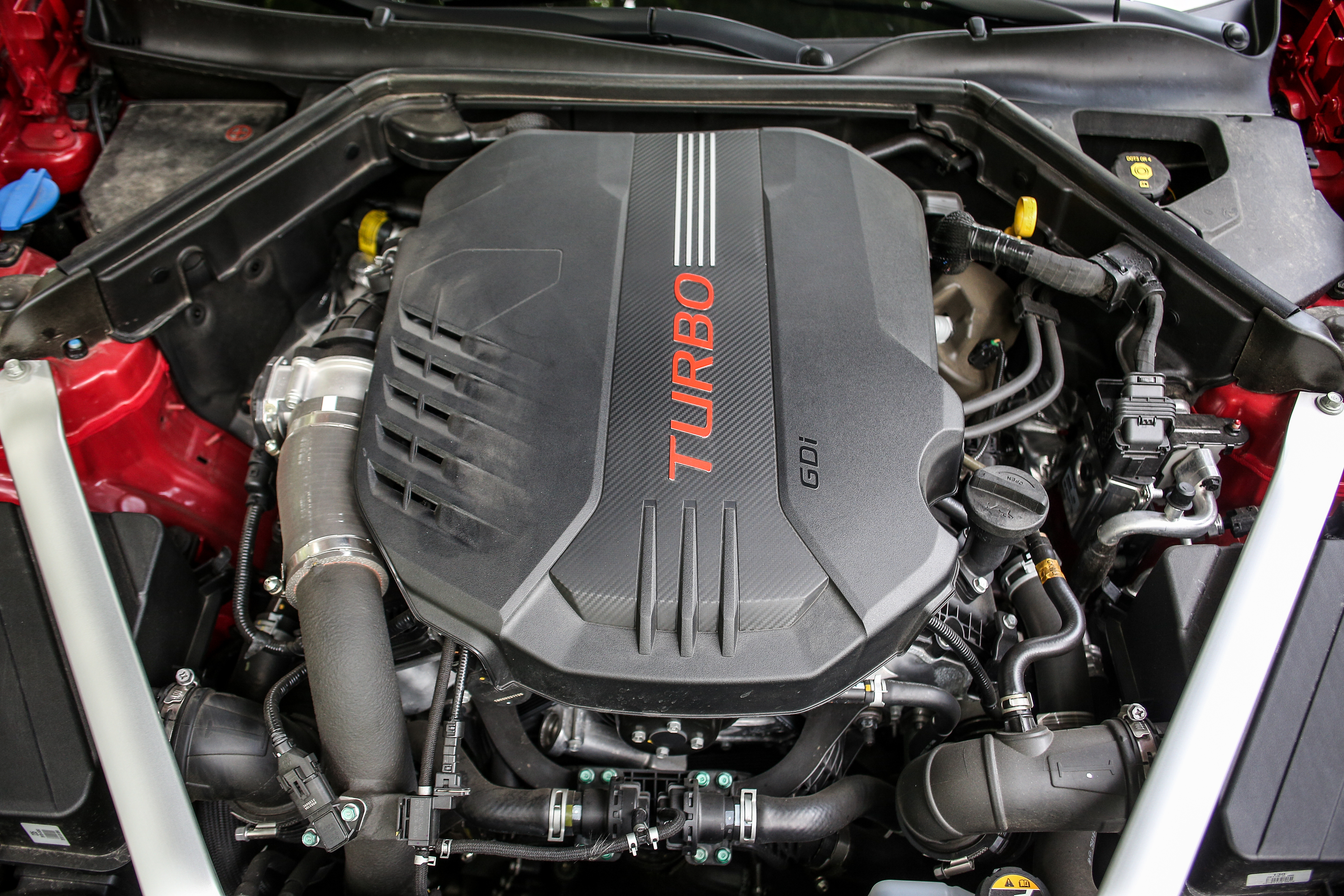 Stinger cu acest motor poate accelera de la 0 la 100 km/h în doar 5.1 secunde, fiind cel mai rapid autoturism produs vreodatã de Kia. Viteza maximã este de 269 kmh. La capitolul consum Stinger cu V6 a înregistrat undeva peste 16-17 litri la suta de km, condus pe autostradă, drum naţional şi oraş, cu depăşiri frecvente în modul Sport+.