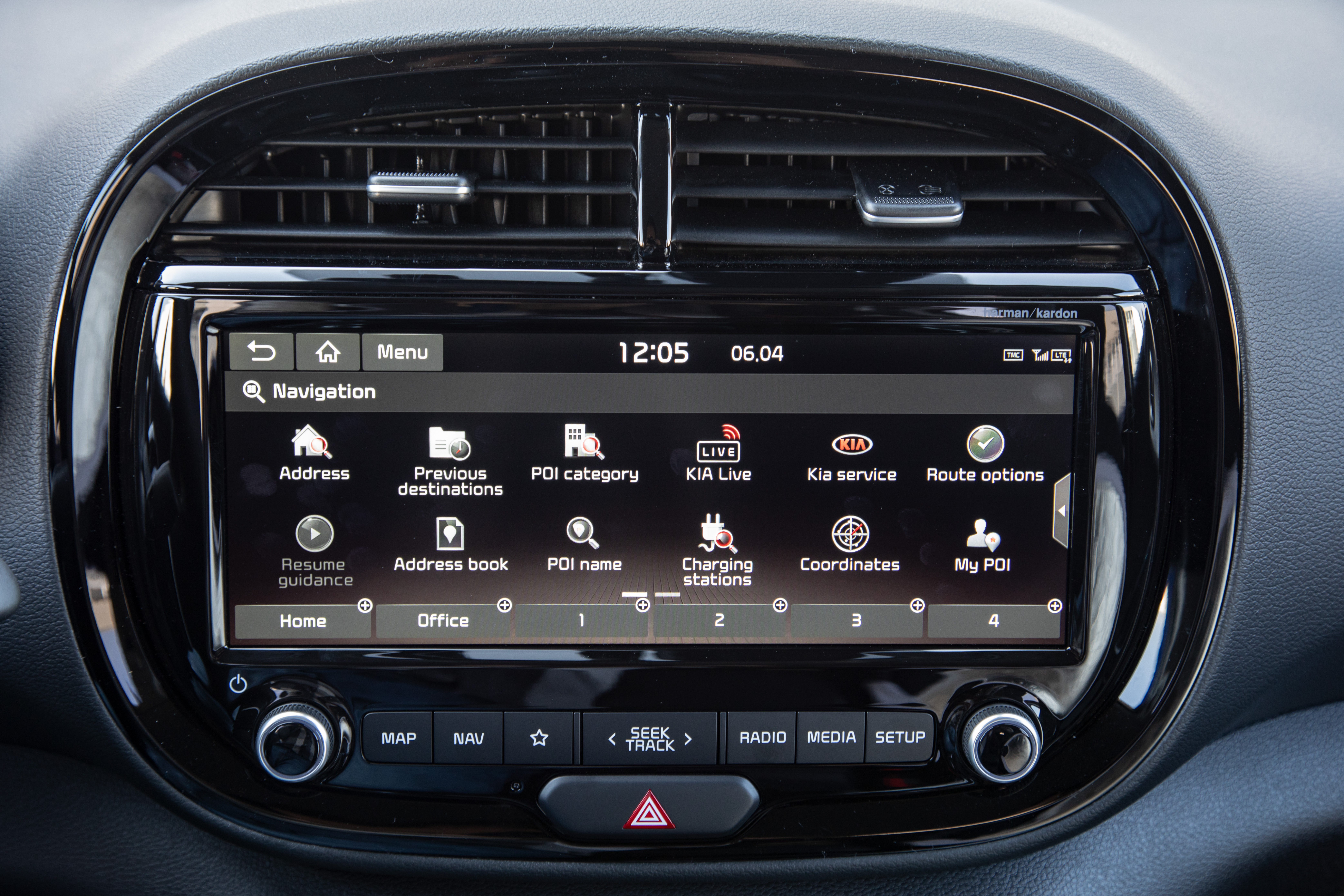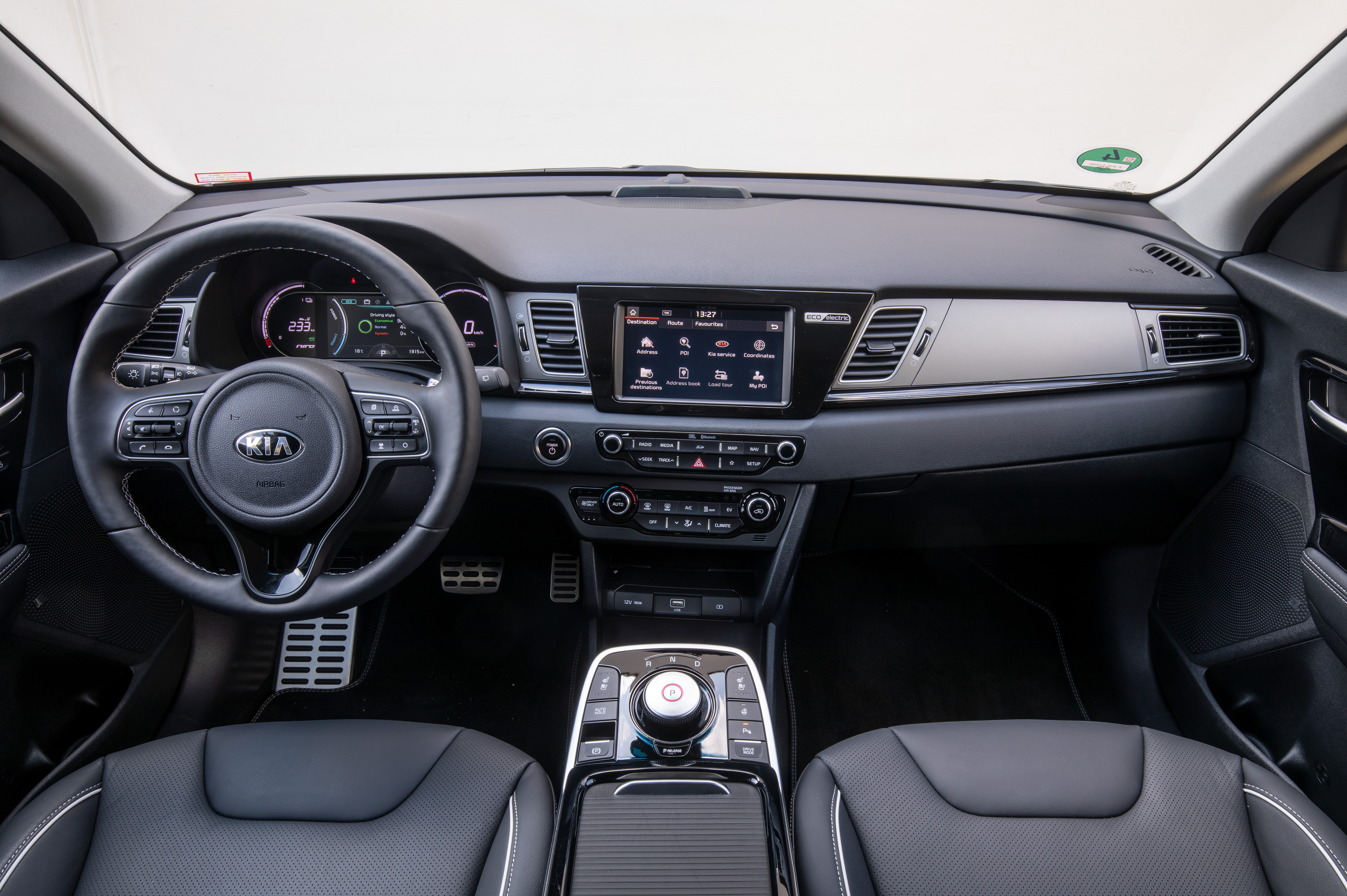 e-Niro este mai cuminte la designul interior, însă bine dotat. Transmisia se comandă prin acelaşi sistem cu rotiţă, iar poziţionat central pe planşa de bord avem sistemul de infotainment cu display tactil de 8 inchi, căruia i s-au adăugat funcţii specifice sistemului electri de propulsive, precum localizarea staţiilor de încărcare din apropiere. Totodată, ceasurile de bord digitale cu display de 7 inchi oferă informaţii despre starea bateriei, stilul de condus, consum şi altele. În spatele volanului găsim padelele pentru starea nivelului de recuperare a energiei, însă în cazul lui e-Niro avem trei niveluri.