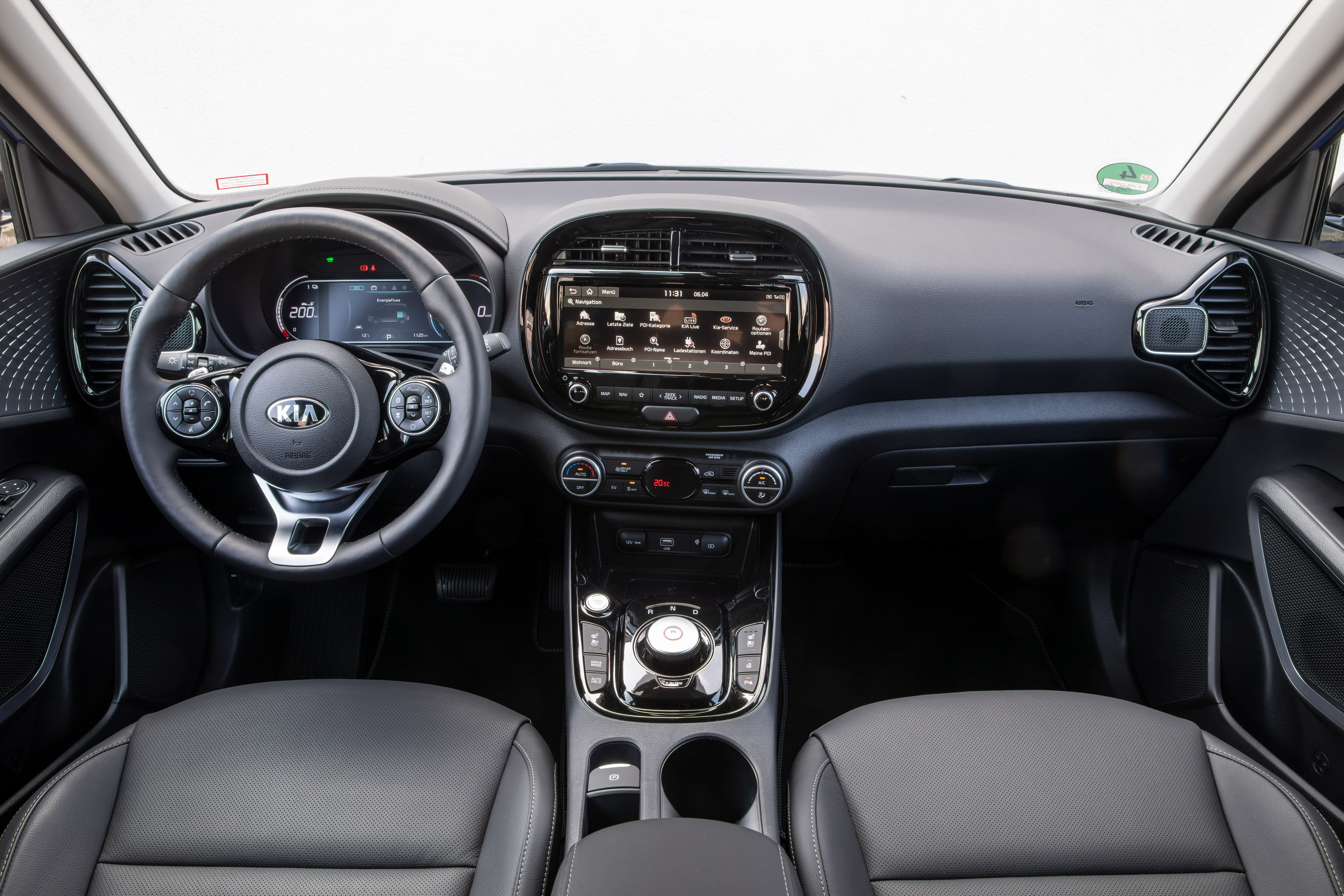 Interiorul lui e-Soul a fost redesenat, iar în centrul lui se află noul sistem de infotainment oferit de KIA, UVO Connect. Cu un display tactil de 10,25 inchi, acesta va fi oferit treptat şi pe alte modele. Aduce modificări de funcţionalitate, dar de şi layout, iar prin intermediului cartelei SIM proprii, poate oferi date despre trafic, vreme şi altele. Are şi sistem de navigaţie cu grafică 3D, conexiune Bluetooth şi suportă Android Auto şi Apple CarPlay. A doua noutate este aplicaţia UVO App, compatibilă cu smartphone-urile Apple şi Android, care permite şoferului să vada pe telefon anumite informaţii sau să activeze de la distanţă funcţii remote. Interesantă este şi rotiţa de acţionare a sistemului de transmisie, cu modul de parcare inserat central, sub forma unui buton.
