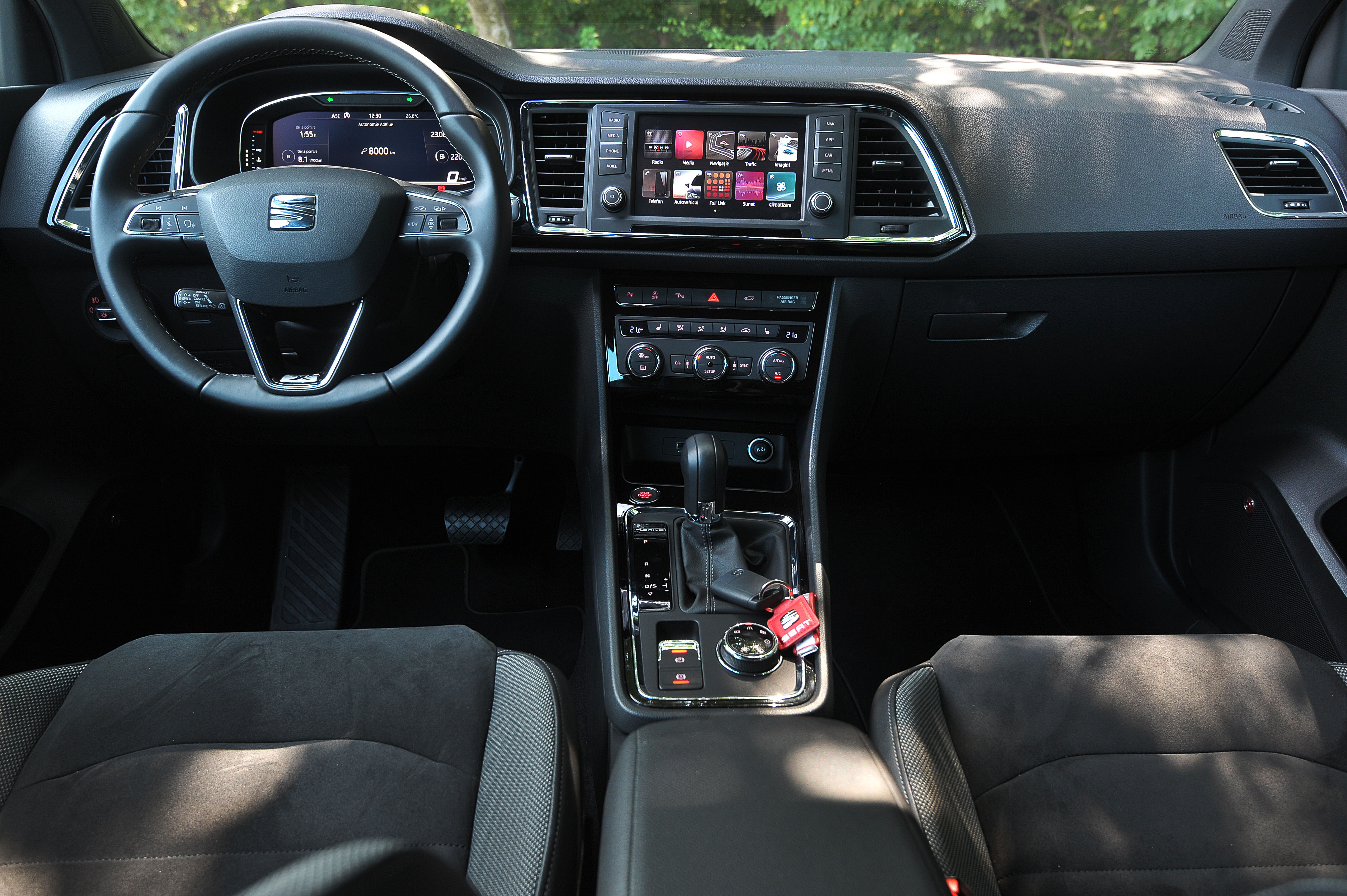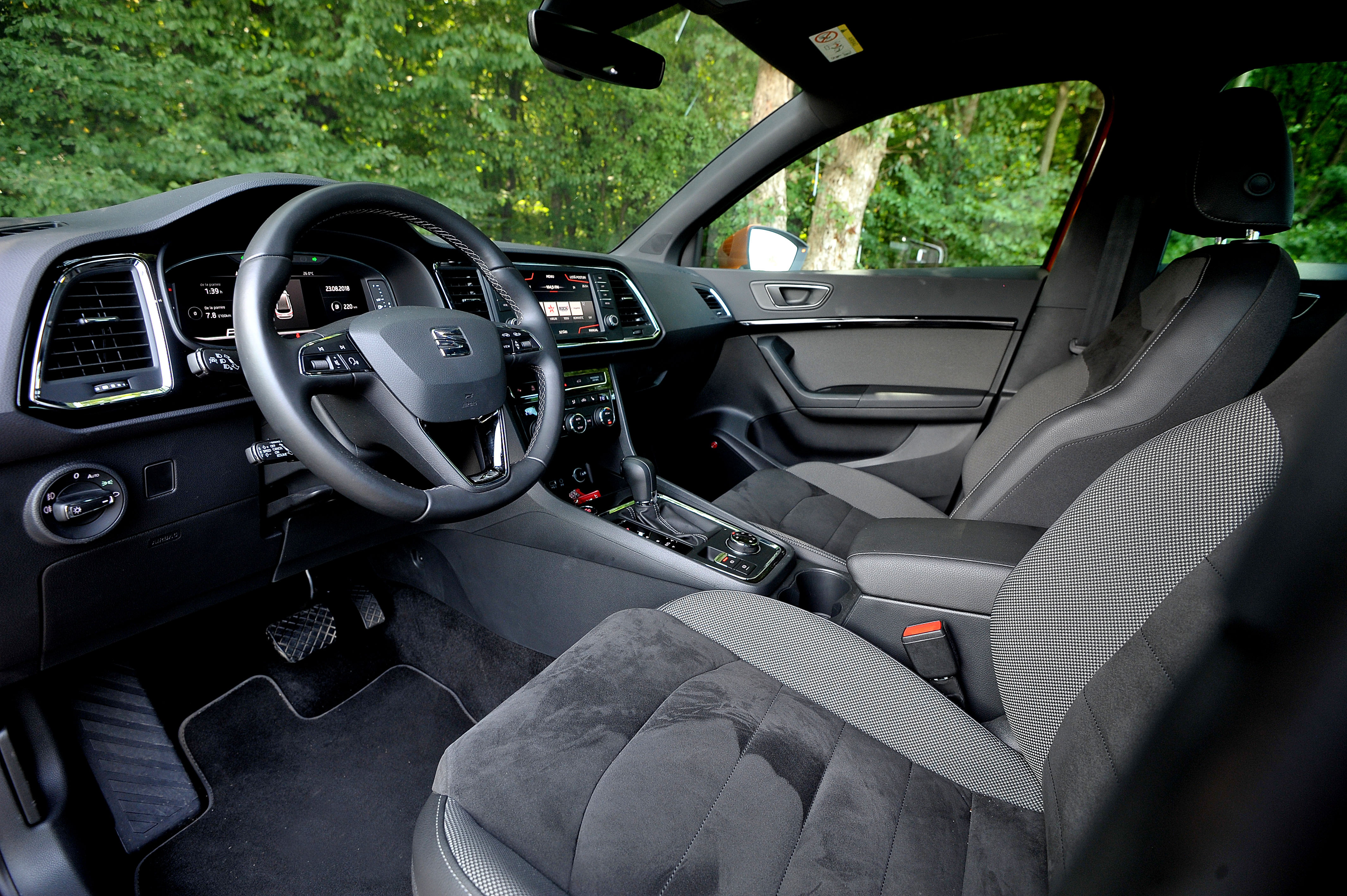 Poziţia în scaunul şoferului este foarte bună, spaţiul la cap fiind mai mult decât suficient, iar vederea în faţă şi lateral este de asemenea bună. Seat Ateca punctează considerabil la capitolele spaţiu şi confort. Volanul este reglabil atât pe înălţime, cât şi pe adâncime, iar modificările se fac foarte fin, ceea ce demonstrează că s-a acordat o grijă specială la materiale şi asamblare.