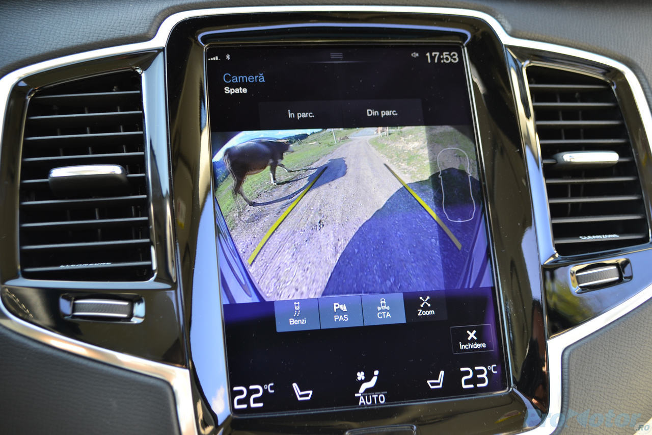 În plus, XC90 te avertizează şi atunci când ieşi din parcare sau de pe o alee cu faţa sau cu spatele şi vine o altă maşină din lateral, te avertizează când vrei să schimbi direcţia iar în unghiul mort ai o maşină, îşi ţine singură banda de rulare (deşi trebuie să ţii mâinile pe volan), îşi ajustează automat viteza faţă de maşina din faţă şi ştie să o urmărească inclusiv din momentul în care aceasta a frânat până la oprire iar apoi a plecat din nou pe de loc şi aşa mai departe. Ah, şi îşi pregăteşte pasagerii pentru un impact din spate, pentru că are un radar şi în partea posterioară…