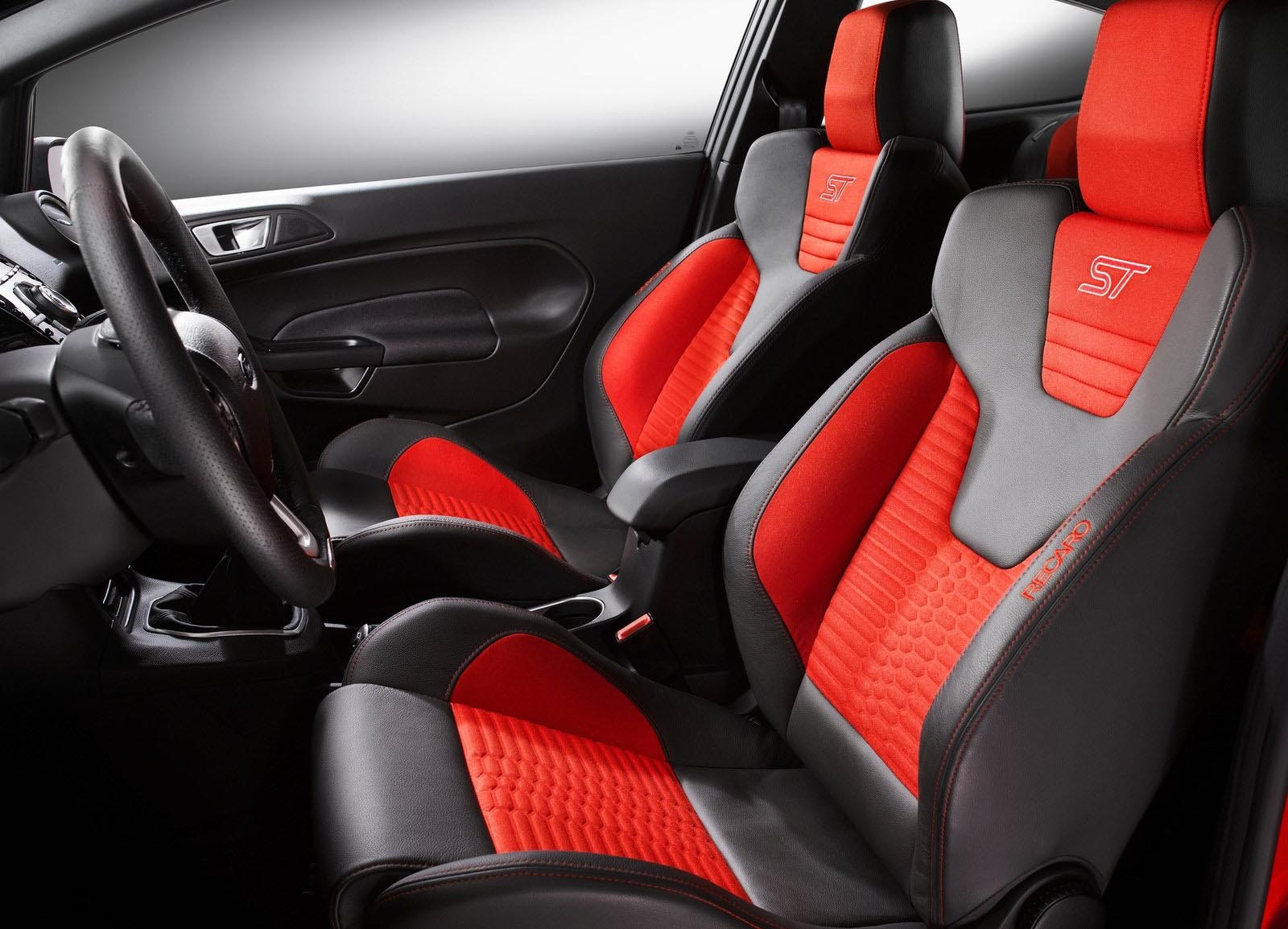Primul lucru pe care l-am remarcat deschizând portiera lui Ford Fiesta ST a fost perechea de scaune Recaro profilate foarte sportiv şi îmbrăcate într-o combinaţie de tapiţerie din piele bi-tonală cu un model foarte interesant.