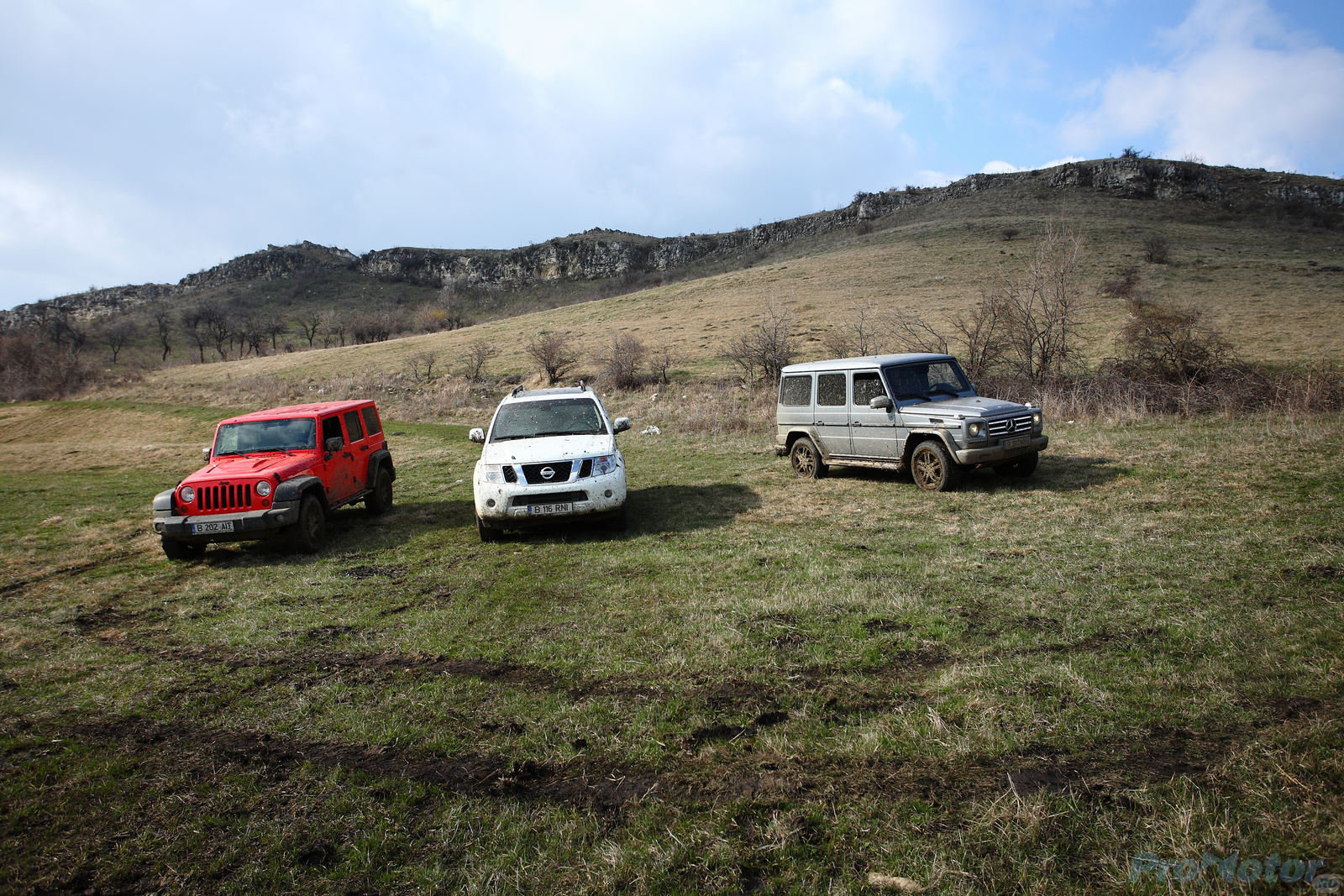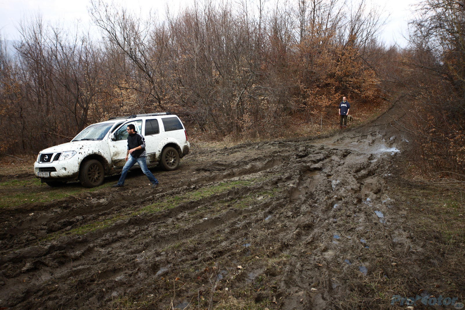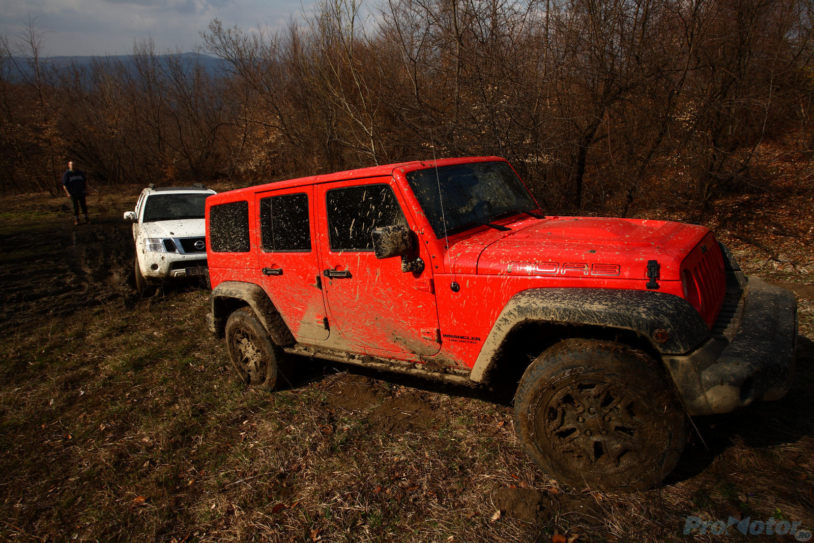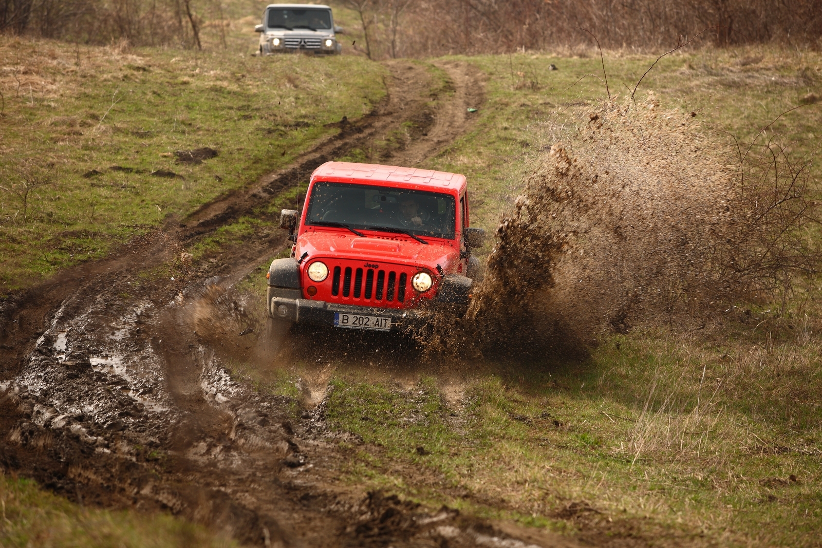 Wranglerul a fost singurul care a reuşit să treacă cu forţe proprii, dar după ce s-a chinuit ceva. Ajuns pe teren uscat, l-am folosit apoi pentru a trage cu şufa celelalte două maşini, care n-au avut nicio şansă în noroiul adânc de jumătate de metru. Nici n-a durat mult toată tevatura – am stat blocaţi aici doar o oră… Problema, din nou, n-a fost capacitatea de trecere, ci anvelopele. Sfat: dacă vă luaţi un Mercedes-Benz G-Klasse sau un Pathfinder, sau un Wrangler… sau ce vreţi voi în domeniul SUV sau offroadere, şi vreţi off-road, nu-l chinuiţi încălţat cu jante şi anvelope de oraş!