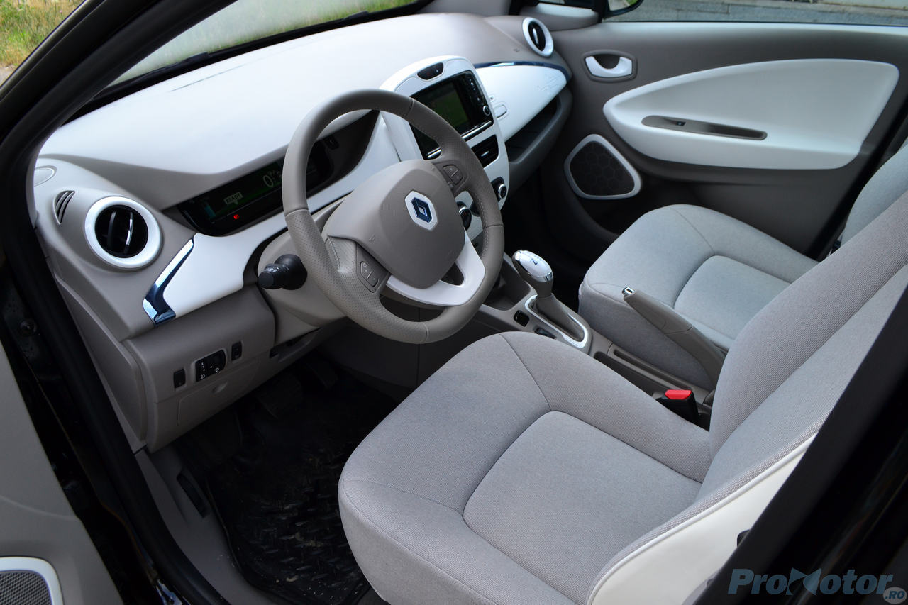 Mă îndoiesc că energia recuperată în baterie de pe urma acestei frânări e mai mare decât cea pe care ai fi conservat-o cu coastingul lui e-Up!, lucru reflectat şi în consumul real mai mare al lui Zoe. Pe de altă parte, dacă vrei ca şi e-Up! să pună frână de motor, vei comuta transmisia acestuia în B şi atunci vei avea un comportament similar, maşina fiind înfrânată imediat ce iei piciorul de pe pedala de acceleraţie. Acestea fiind spuse, sistemul de recuperare a energiei de pe Zoe nu e nici pe departe la fel de brutal ca acela de pe i3, de exemplu. Are totuşi avantajul că plăcuţele de frână vor fi folosite foarte rar…