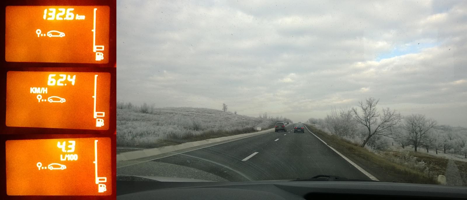 La plecarea din Bucureşti am întâmpinat condiţii de ceaţă pe autostradă, aşa încât o perioadă am mers mai precaut, cu maximum 100 km/h. După care, la risipirea ceţii, am abordat un stil normal, crescând viteza până la maximum 130-140 km/h.
