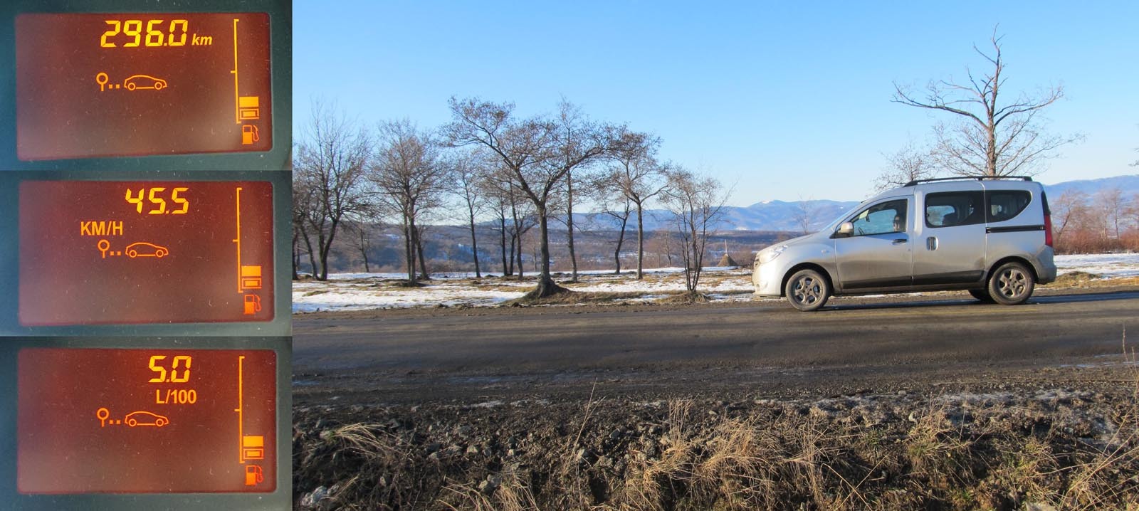Dat fiind că la viteze mari Dokker-ul e dezavantajat de aerodinamică, faptul că am mers tare cam în jumătate din acest traseu şi am avut şi destule porţiuni de urcare explică de ce consumul a fost peste 5 litri/100 km. Totuşi, consider că 5,4 litri/100 km este o valoare rezonabilă în condiţiile date.