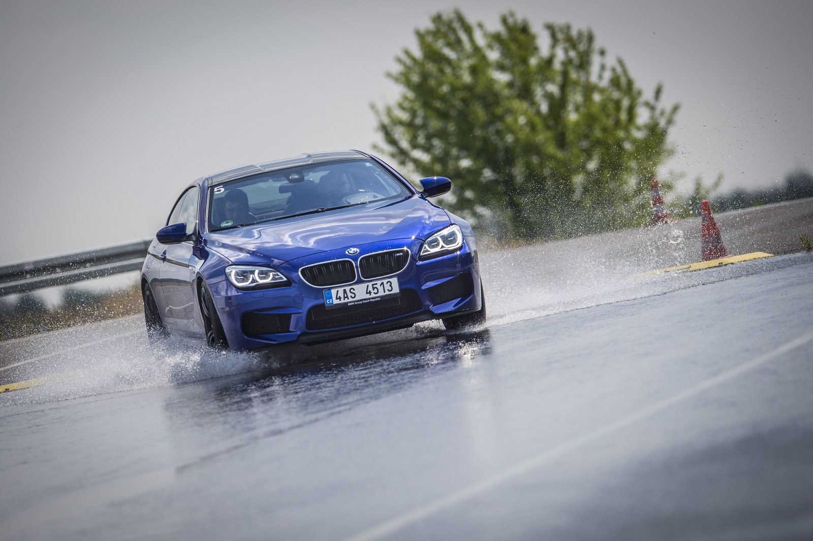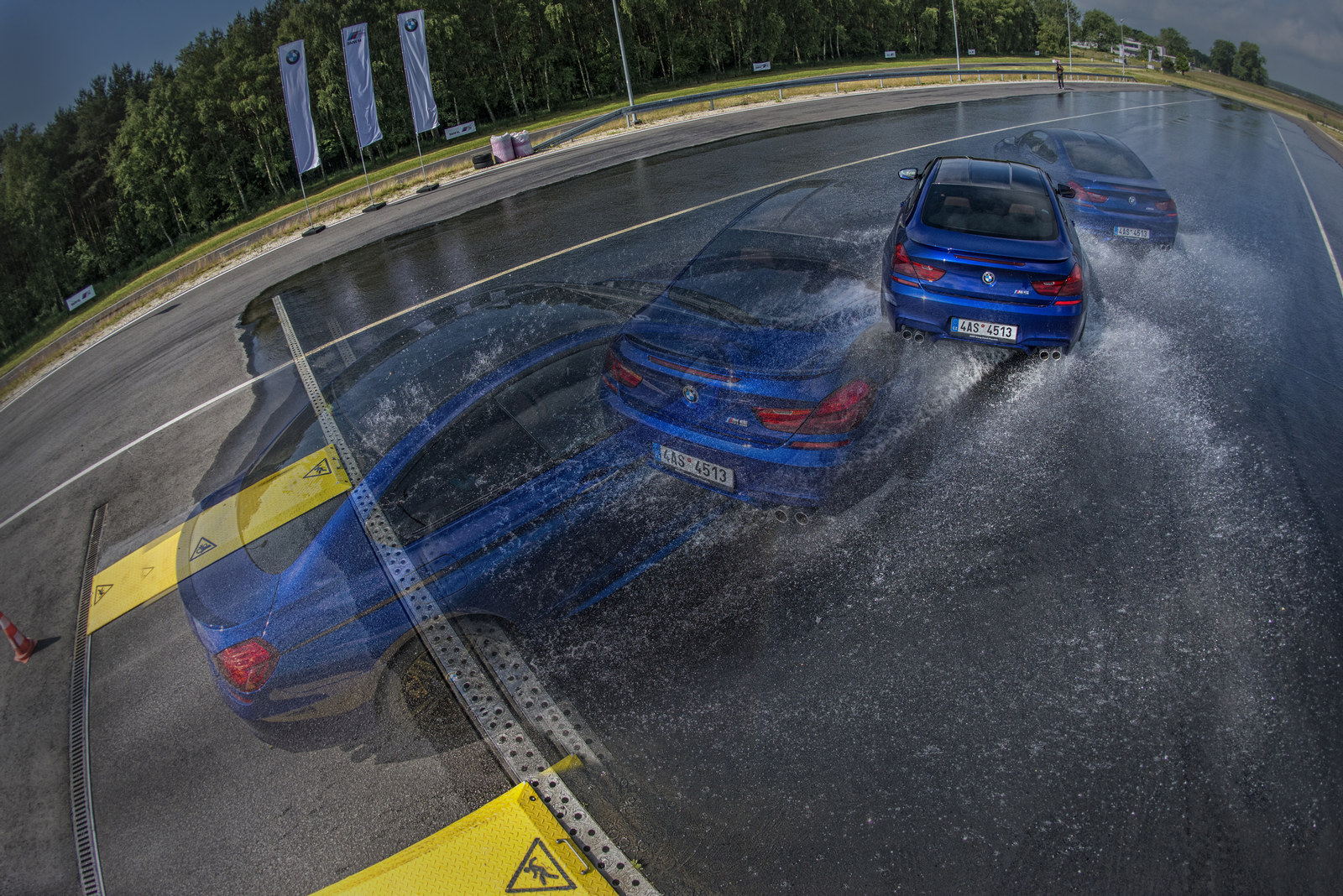 După derapajele controlate pe suprafaţă umedă, cel de-al doilea exerciţiu de învăţare m-a pus faţă în faţă cu un circuit pe care mă aşteptau câteva capcane ascunse – obstacole care ieşeau din drum (şi pe care trebuia să le evit) şi o platformă care destabiliza puntea din spate a maşinii ca să simuleze ruperea bruscă a aderenţei. Bineînţeles, toate acestea s-au întâmplat pe asfalt udat din belşug cu apă, aşa că supravirările şi subvirările au fost pe ordinea zilei – o dată cu M6 Coupe şi o dată cu noul X6M.