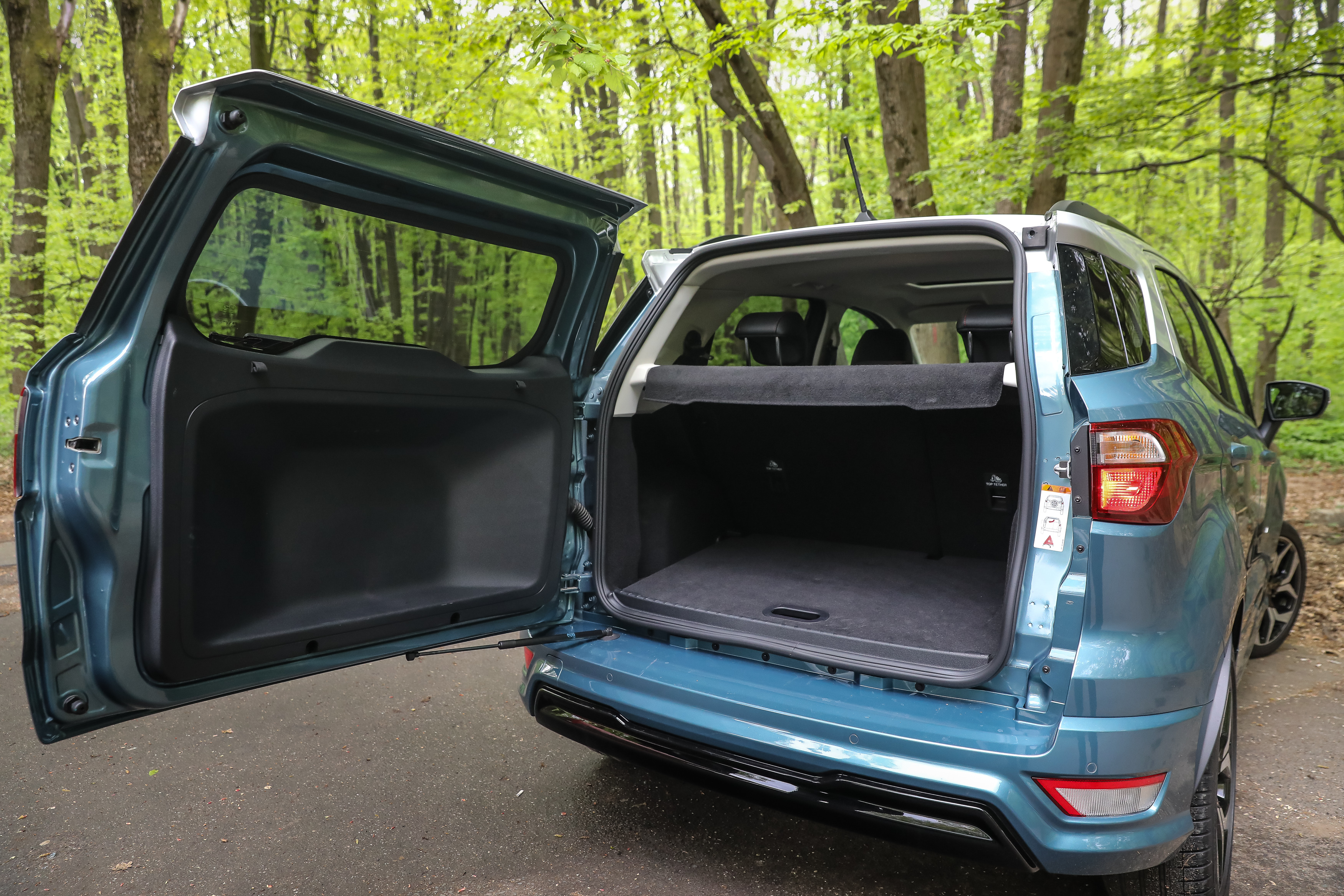 Portbagajul are o capacitate de 356 de litri, iar maşina poate fi echipată cu roată de rezervă amplasată pe portiera portbagajului. Un detaliu care merită amintit, cu care se mândresc cei de la Ford, este podeaua ajustabilă a portbagajului care cântăreşte doar 3 kilograme, dar care, potrivit companiei, poate să susţină încărcături de până la 300 de kilograme. Pentru a crea „podeaua-fagure”, inginerii au intercalat între două straturi din fibră din sticlă şi un strat de celule de tip fagure construite din hârtie reciclată.