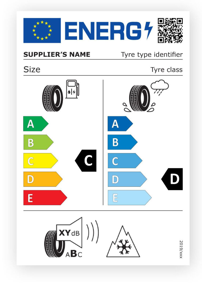 Eticheta UE a anvelopelor cuprinde cele mai importante informații legate de caracteristicile pneurilor. Este obligatorie încă din 2012. Acestea codifică rezistența la rulare (un indicator al consumului de combustibil) și aderența pe drumuri ude (distanța de frânare) în clase de eficiență de la A la G. Cu cât litera este mai la începutul alfabetului, cu atât performanțele sunt mai bune.
