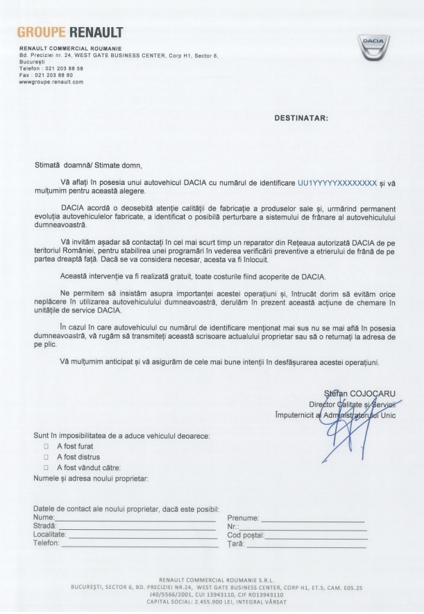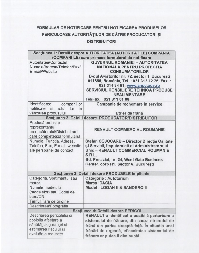 Renault Commercial Roumanie a notificat Autoritatea Naţională pentru Protecţia Consumatorilor despre începerea derulării unei campanii de rechemare în service a autoturismelor DACIA Logan II & Sandero II. Anunţul a fost făcut pe pagina de Facebook a Autorităţii Naţionale pentru Protecţia Consumatorilor.