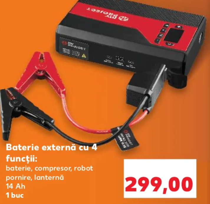 Un echipament multifuncțional care combină patru instrumente utile: baterie externă, compresor, robot de pornire și lanternă. Cu o capacitate de 14 Ah, poate reporni motorul unei mașini cu bateria descărcată, umple roțile și funcționează ca sursă de lumină în caz de urgență. O soluție completă pentru orice situație neprevăzută.