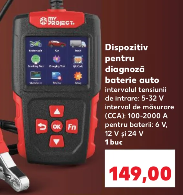 Pe lângă roți, merită verificată și starea bateriei, mai ales în sezonul rece. Dispozitivul pentru diagnoză funcționează în intervalul 5–32 V și poate măsura curentul de pornire (CCA) între 100 și 2000 A. Este compatibil cu baterii de 6, 12 și 24 V, oferind informații utile despre starea de încărcare și funcționarea alternatorului.