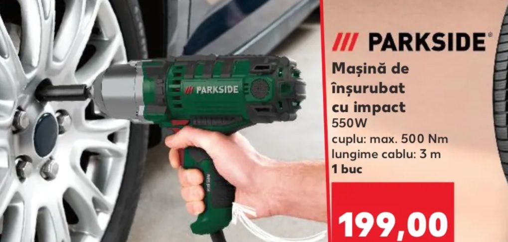 Un ajutor real pentru schimbarea rapidă a roților, considerată un adevărat produs-vedetă al gamei Parkside. Mașina de înșurubat cu impact de 550 W atinge un cuplu maxim de 500 Nm și este echipată cu un cablu de 3 m. Ideală pentru desfiletarea piulițelor de roată, fără efort și fără risc de deteriorare a prezoanelor.