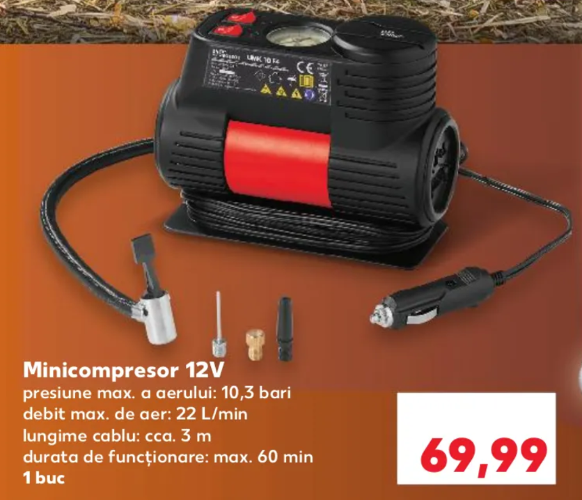 După montarea roților de iarnă, verificarea presiunii este esențială. Minicompresorul auto de 12 V, cu o presiune maximă de 10,3 bari și debit de 22 l/min, este ideal pentru reglaje rapide direct în garaj. Se conectează la priza mașinii și poate funcționa până la o oră, suficient pentru a aduce toate cele patru roți la presiunea corectă.